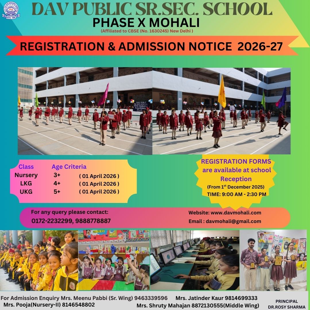 DAV Mohali is duly affiliated with CBSE, New Delhi upto +2 stage and directly managed by the most renowned and universally recognized Educational Organization
